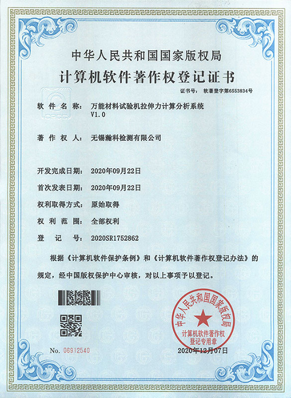 萬能材料試驗(yàn)機(jī)拉伸力計(jì)算分析系統(tǒng)V1.0著作權(quán)登記證書